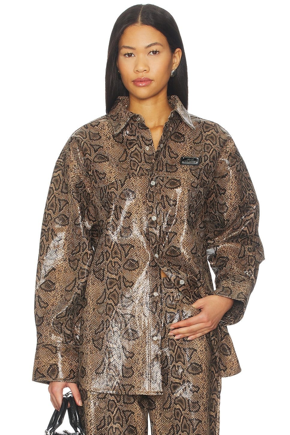 The Ksubi Leather Shirt features a snakeskin print across its entire surface, offering a bold and edgy statement piece. The button-front closure adds a classic touch, while the long sleeves and buttoned cuffs provide a structured finish.