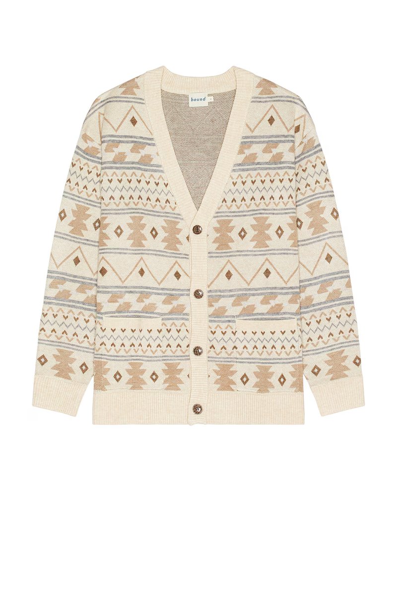 Crafted with a cozy, cream hue, this Aztec Grandad Cardigan from Revolve features a distinctive pattern. Designed for warmth and style, it's perfect for layering over casual outfits.