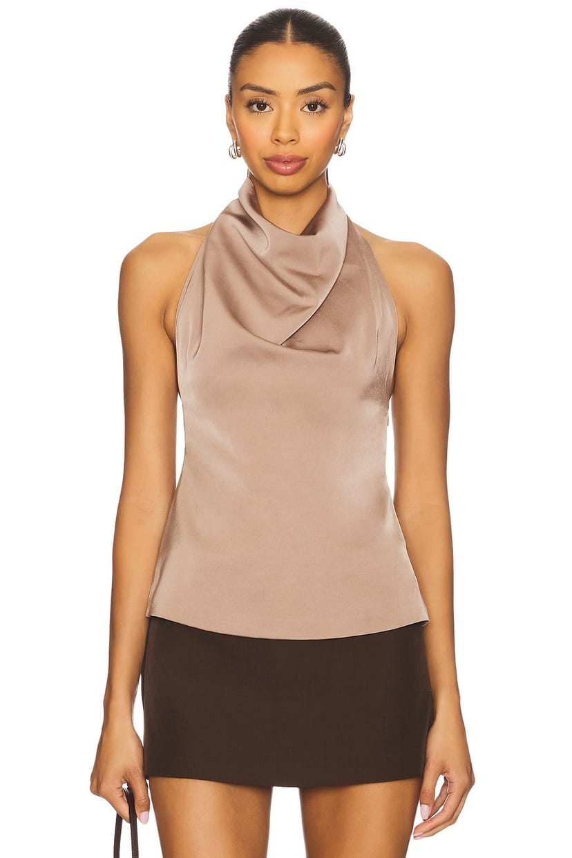 Sleek Mocha halter top by Revolve featuring a silk-like fabric with a draped neckline and sheer back. Ideal for a chic evening look.