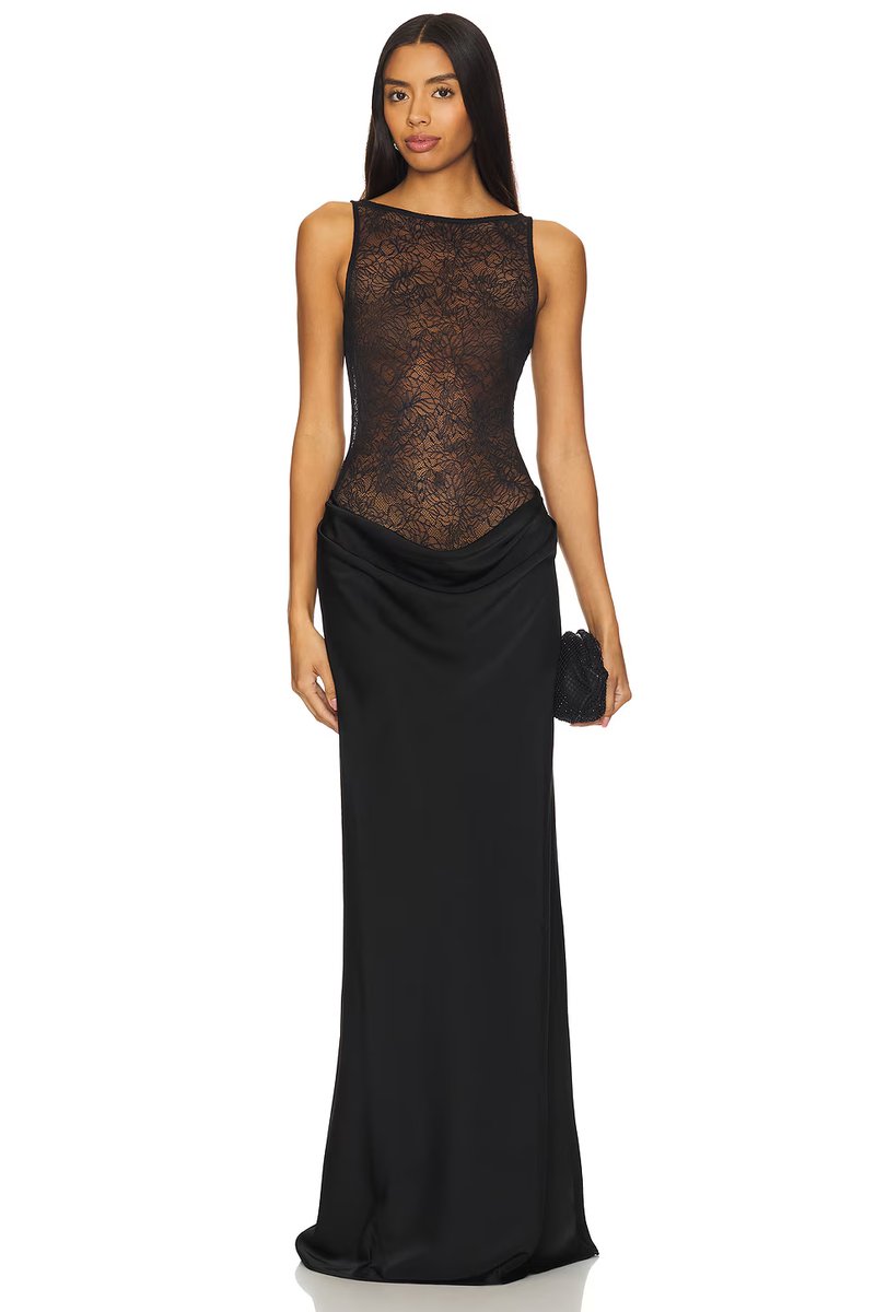 The Betty Gown from Revolve is a stunning piece featuring a sheer lace bodice with a flowing skirt. Perfect for evening events.
