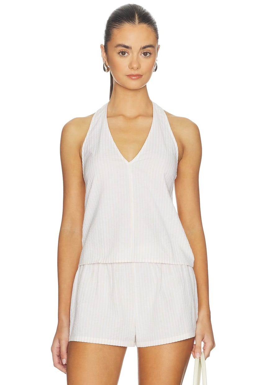 The Revolve Cream & White Striped Halter Top is ideal for casual, beach, outings.