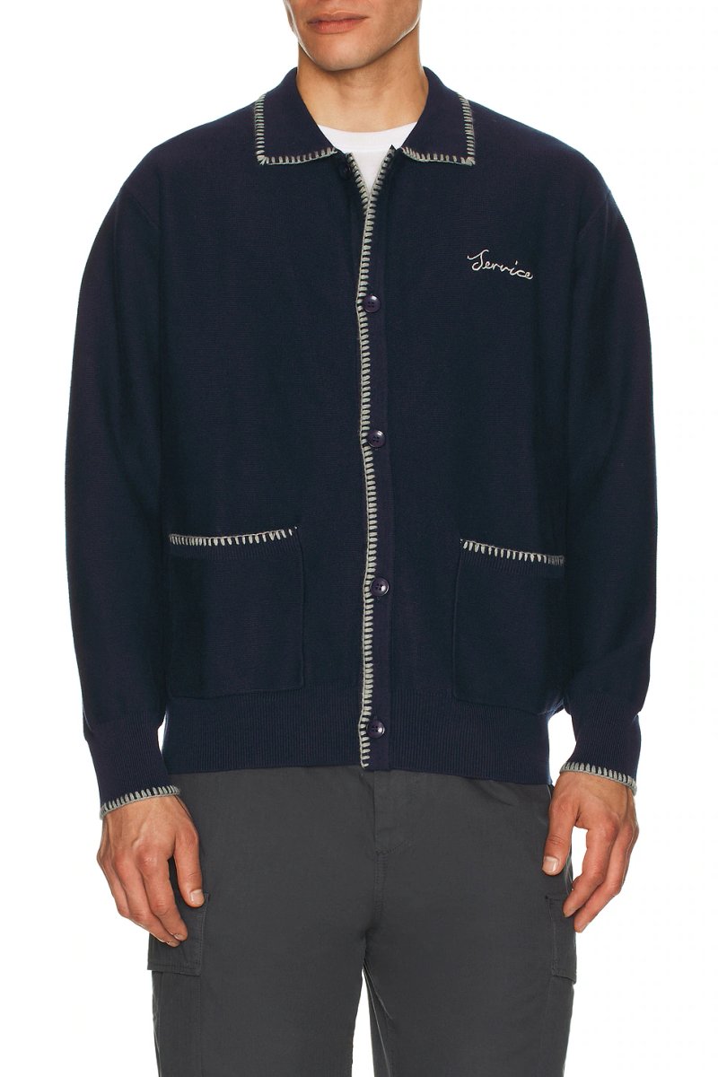 This blanket stitch cardigan from Service Works features a crew neckline and is made from a cozy knit fabric. Its long sleeves and button-front closure make it a versatile addition to any wardrobe.
