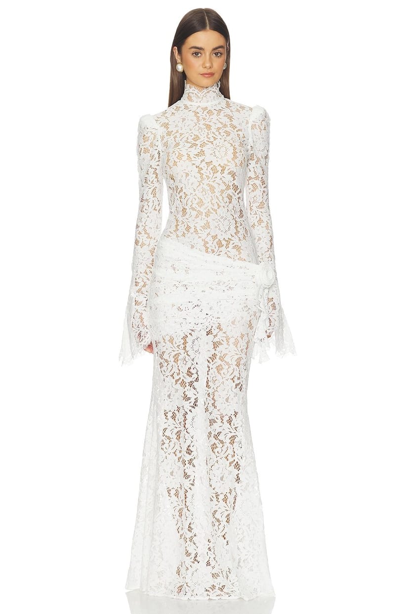 This white lace maxi dress by DE LA VALI features a high neckline, long sleeves, and a flowing silhouette. Perfect for formal events or evening wear.