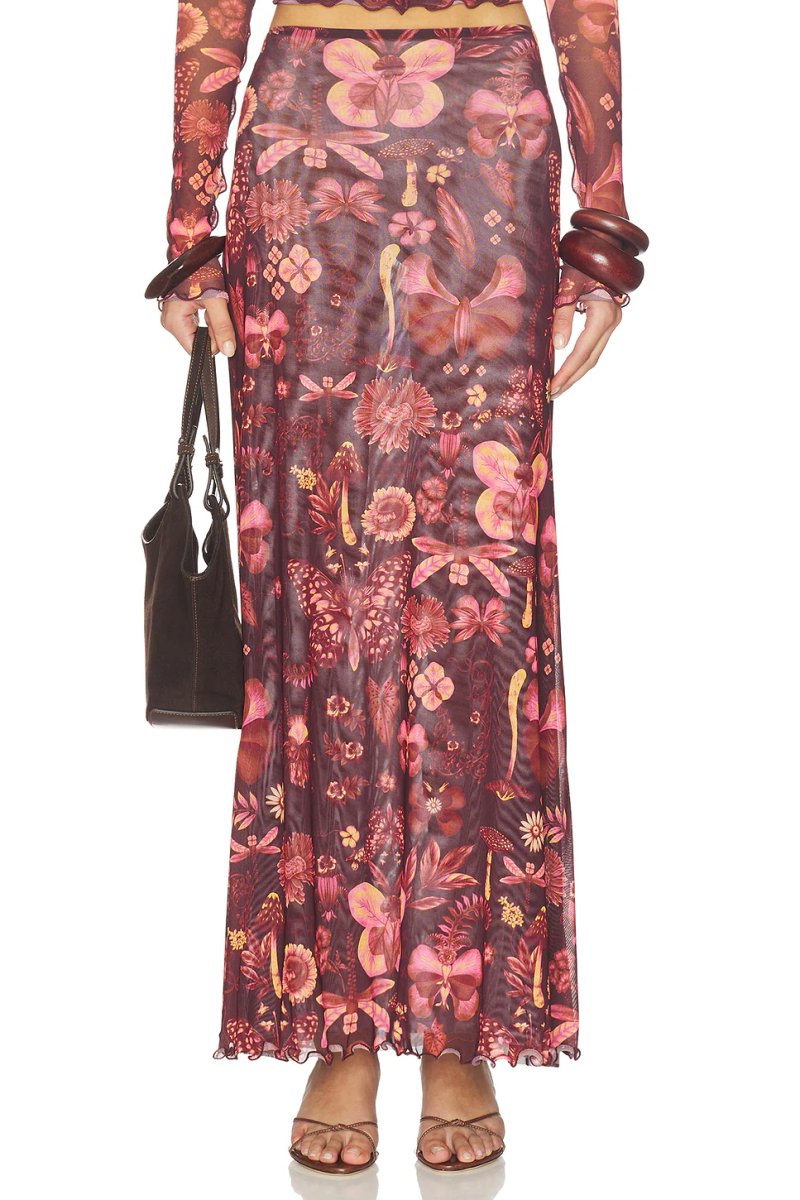 The floral print midi skirt from Agua Bendita is crafted in a vibrant red hue. This skirt features a flowing silhouette and intricate floral patterns that add a touch of elegance to any outfit.