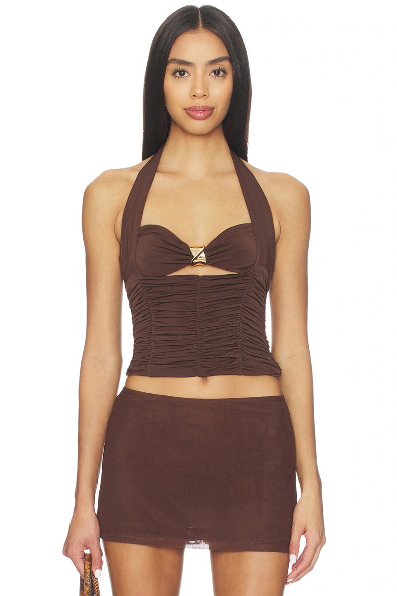 The Briallen Top by revolve features a halter neckline and ruched detailing in a Chocolate hue, perfect for a casual or evening look.