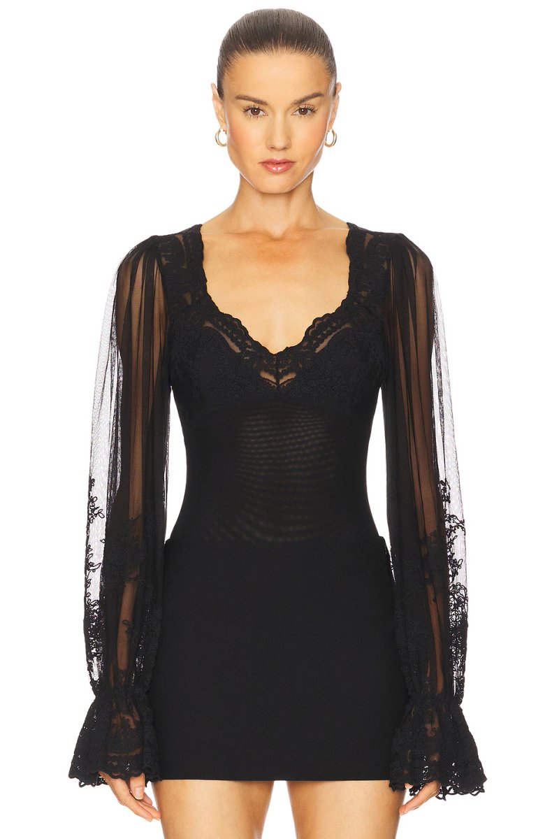 The Revolve Bruna Lace Detail Bodysuit in Black is ideal for evening, special occasions.