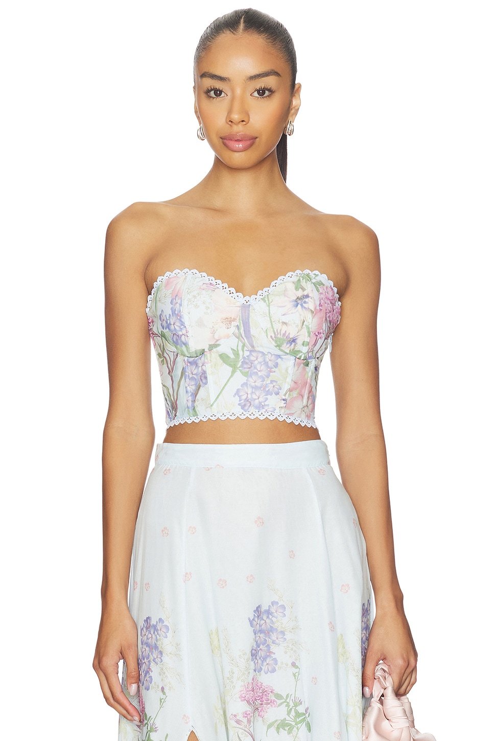 The Revolve Floral Bustier Crop Top in Blue Botanic is ideal for casual.