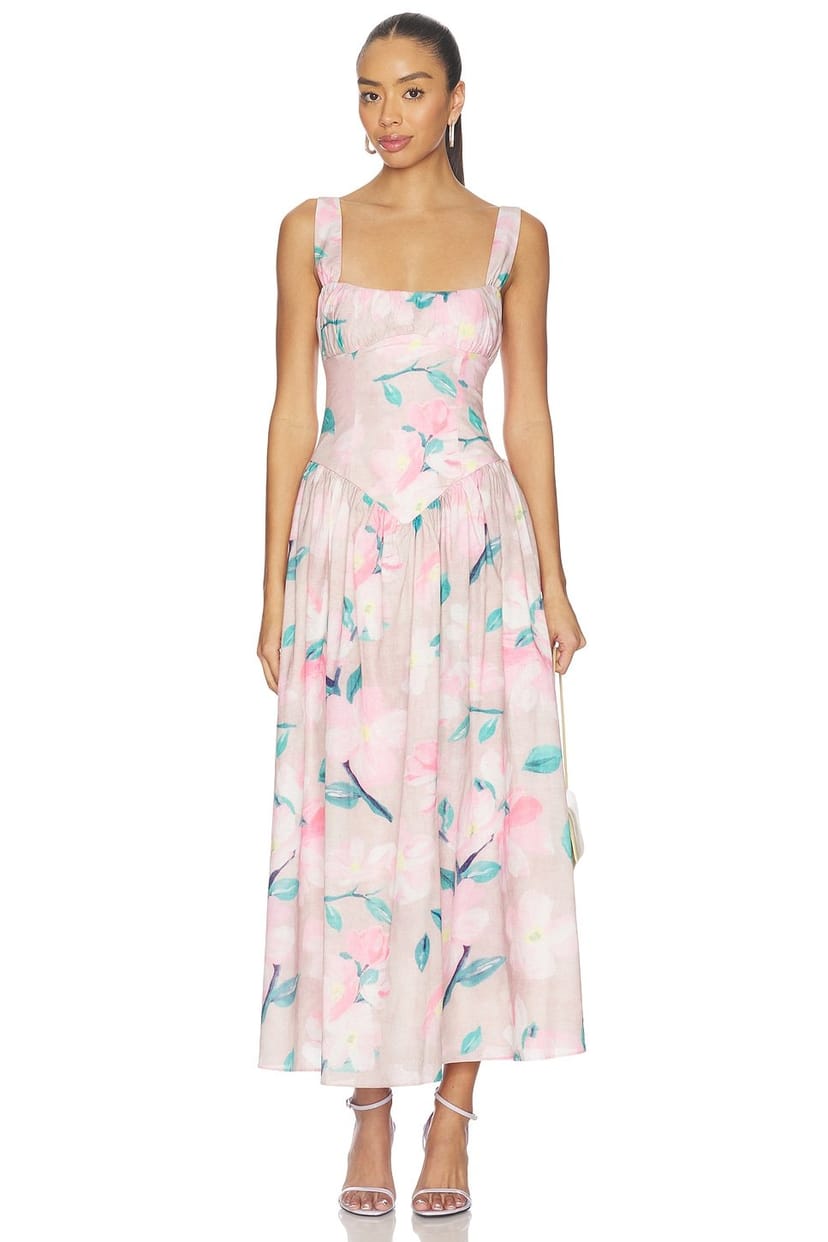 The Revolve Bardot Printed Midi Dress in Pink Floral is ideal for casual, evening.