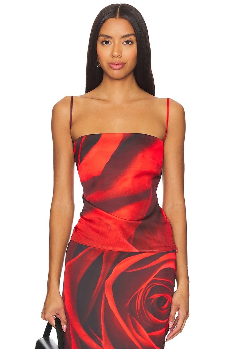 The Charlie Tank from Revolve features a striking Magnified Rose print, designed for a slim fit and perfect for casual and evening occasions.
