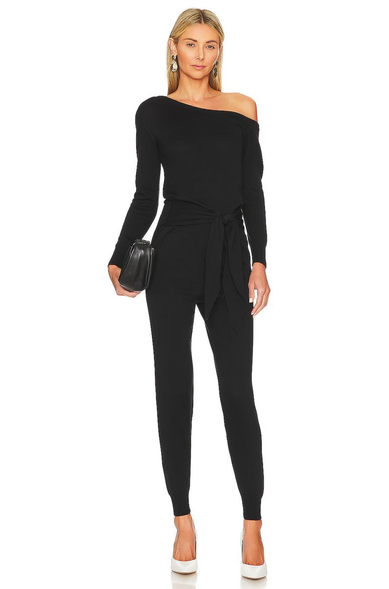 The Charlotte Jumpsuit from revolve features a sleek, off-shoulder neckline and long sleeves. Crafted from stretchy fabric, it offers a slim fit that flatters the figure. Ideal for both casual and formal occasions.