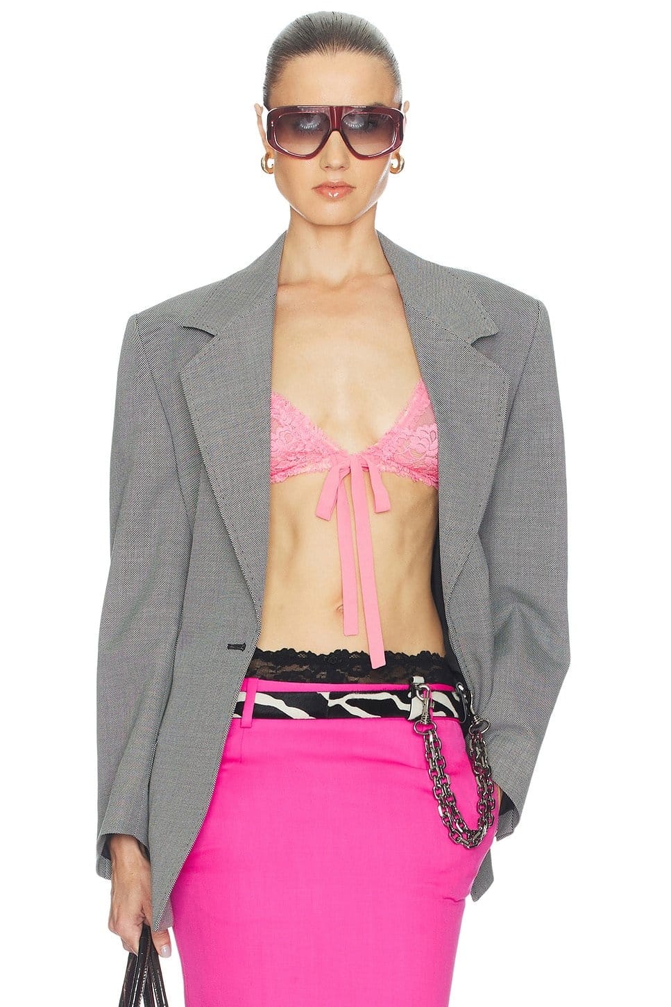 Pair with a pink lace bralette and high-waisted neon pink trousers for a bold, fashion-forward ensemble.