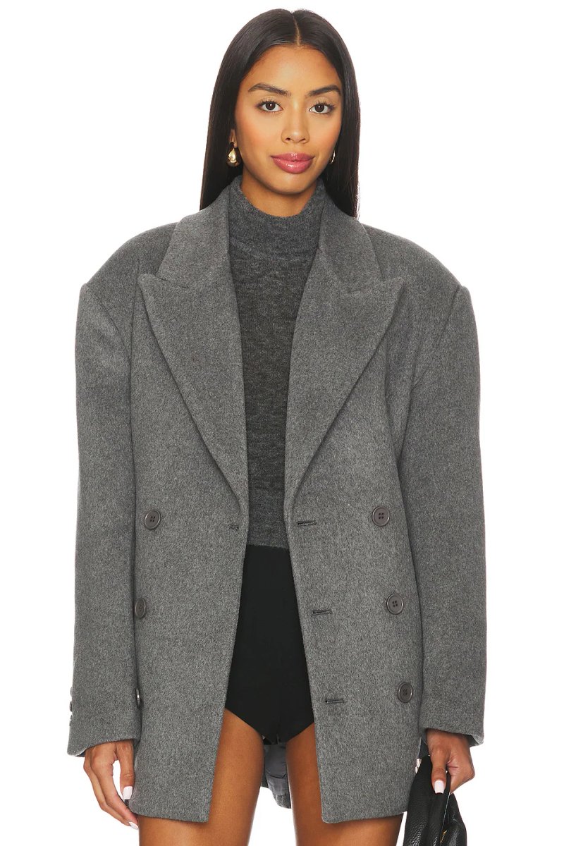 Crafted with a classic silhouette, this Dove Grey oversized Hailey Coat from Revolve features a bardot neckline and double-breasted button closure for a polished look. The wool blend fabric ensures warmth and durability, making it perfect for layering.