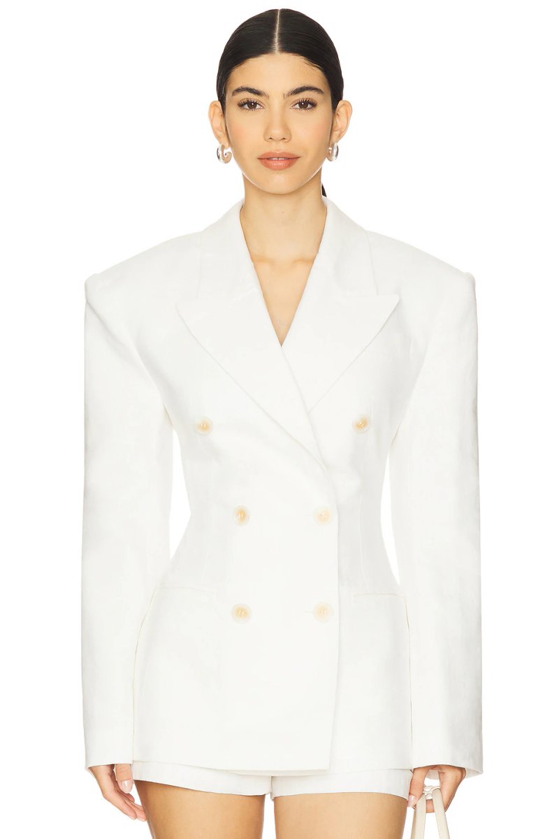 The Revolve Ronny Kobo Double Breasted Blazer in White is available in sizes XXXL, XXL, XL, XS, L, M, S.