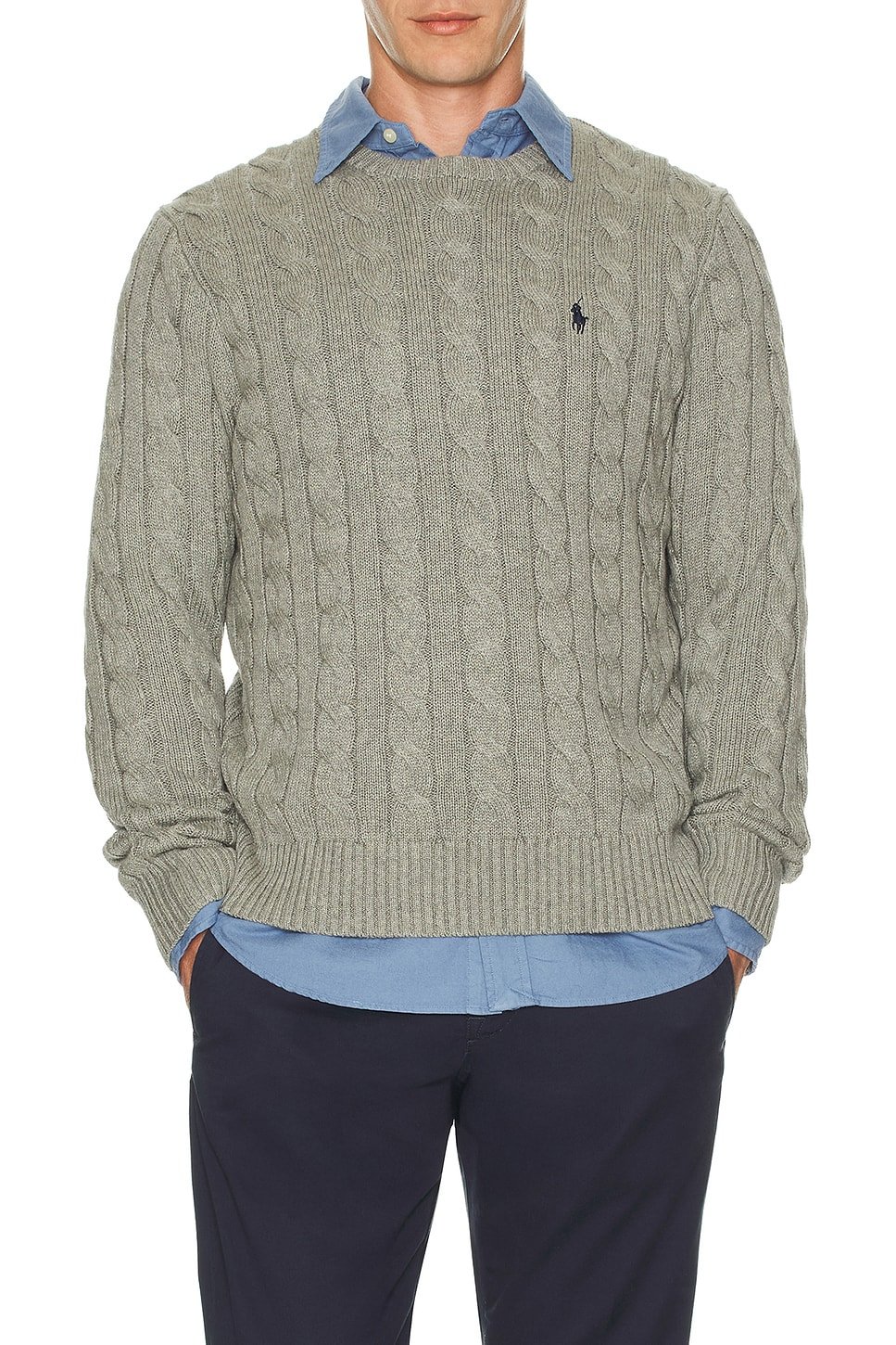 The Polo Ralph Lauren Fawn Grey Heather Cable Knit Crewneck Sweater is available in sizes XXXL, XXL, XL, XS, L, M, S.