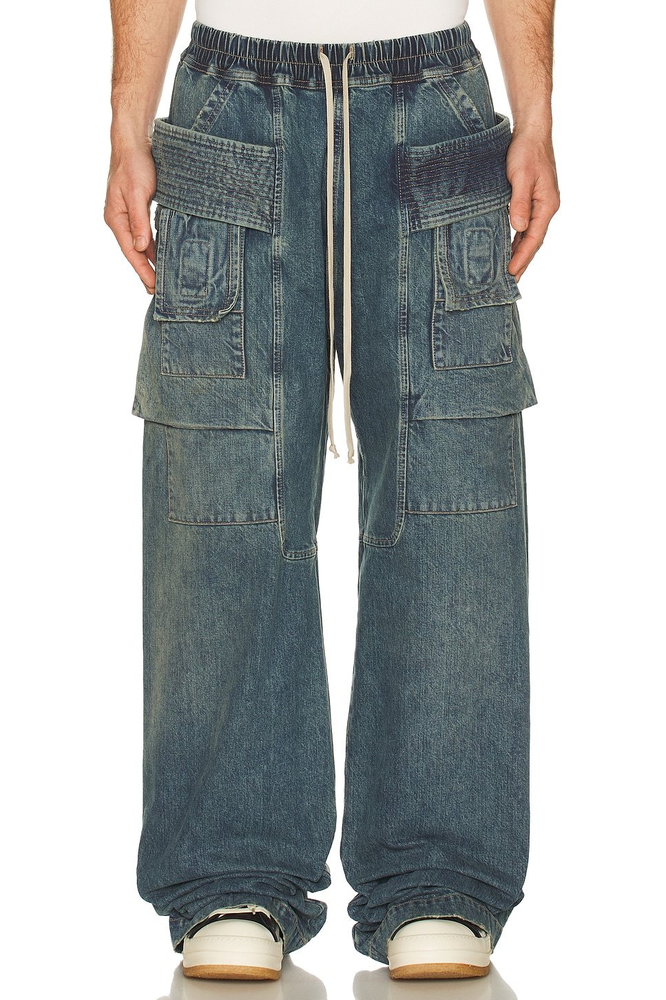 The Rick Owens Wide Cargo Drawstring Trousers in Washed Indigo is available in sizes XXXL, XXL, XL, XS, L, M, S.