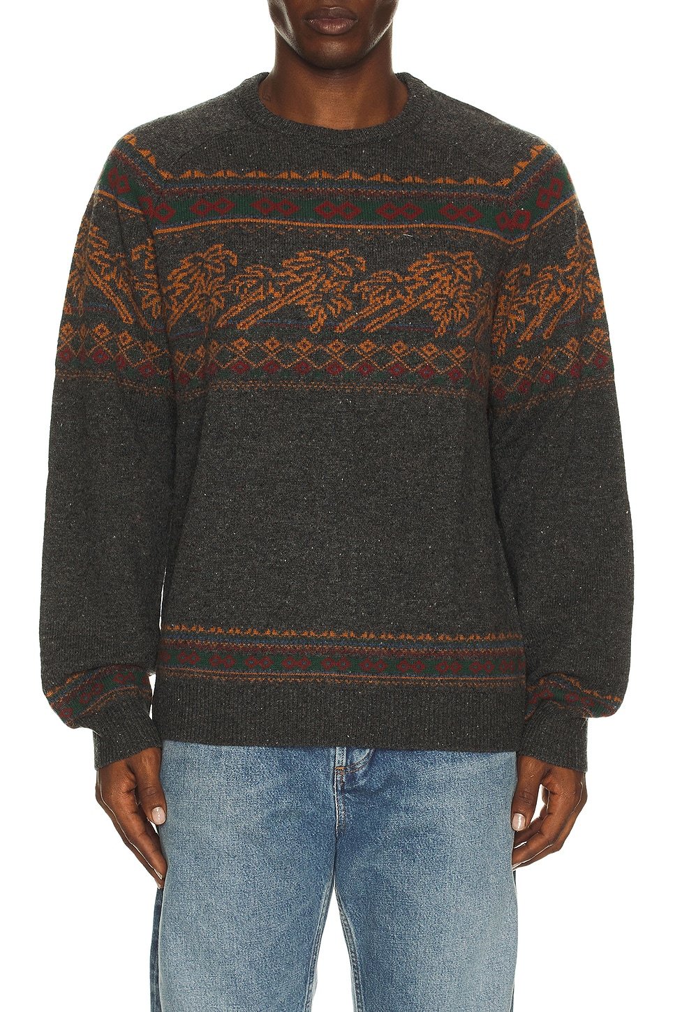 The Donegal Crew Neck Sweater by Faherty features a crew neck and long sleeves. Crafted with a Fairisle pattern, this sweater adds a touch of texture and style to any outfit.