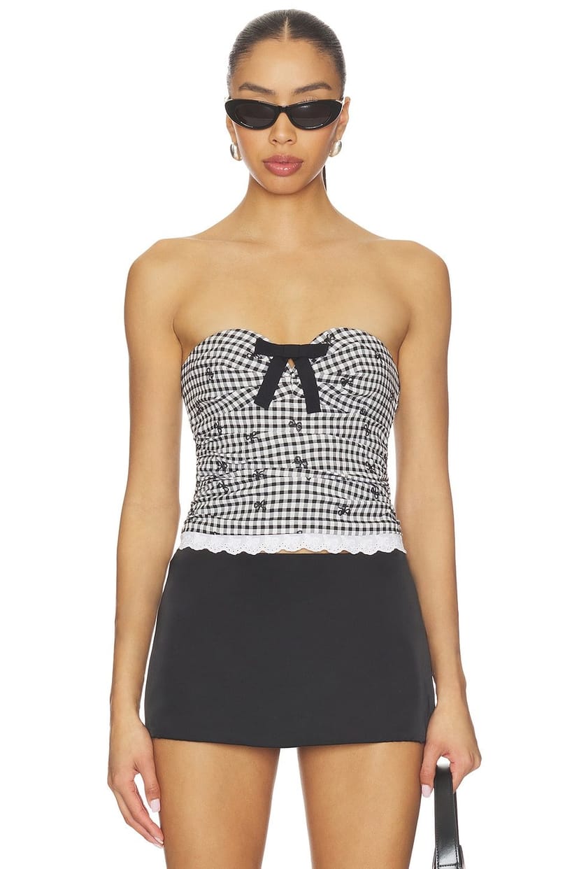 The Emilia Top by Revolve features a black & white gingham pattern with a corset-style design, perfect for adding a touch of femininity to your wardrobe. Its lace trim and adjustable bow provide a flattering fit.