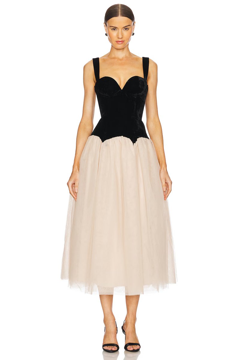 The Estella Midi Dress by revolve features a stunning black and tan design with velvet bodice and tulle skirt. This elegant piece is perfect for special occasions and evening events.