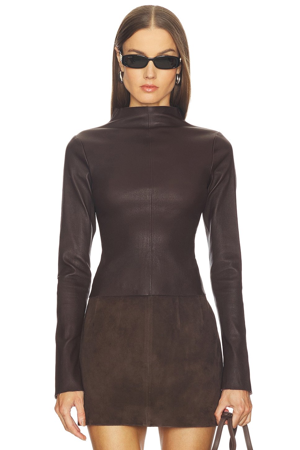 The Revolve Elegant High Neck Long Sleeve Leather Top in Chocolate is ideal for casual, date-night.