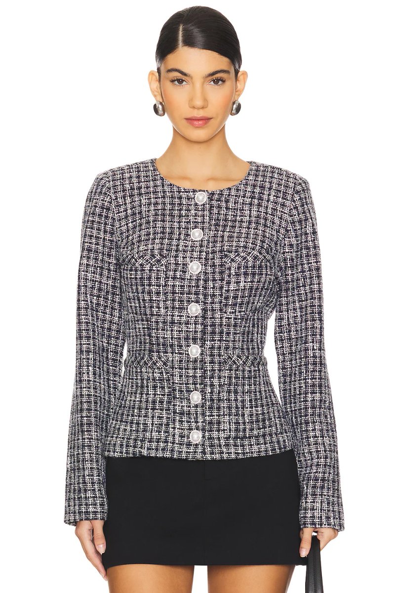 The Evelyn Jacket by revolve is crafted in a tweed fabric with a checkered pattern in navy and white. Its button closure and full sleeves make it a versatile piece suitable for both casual and smart-casual settings.