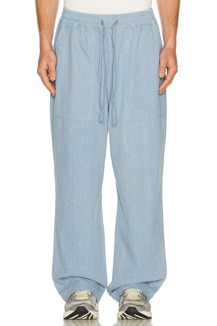 Light Blue Fatigue Stripe Denim Pants from Revolve. Designed with light blue, fatigue stripe, denim, wide leg, drawstring waist. Perfect for casual and smart-casual occasions.
