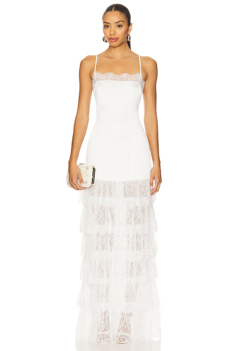 This elegant white maxi lace dress from Revolve features a fitted bodice and flowing layered skirt. Perfect for special occasions and evening events.