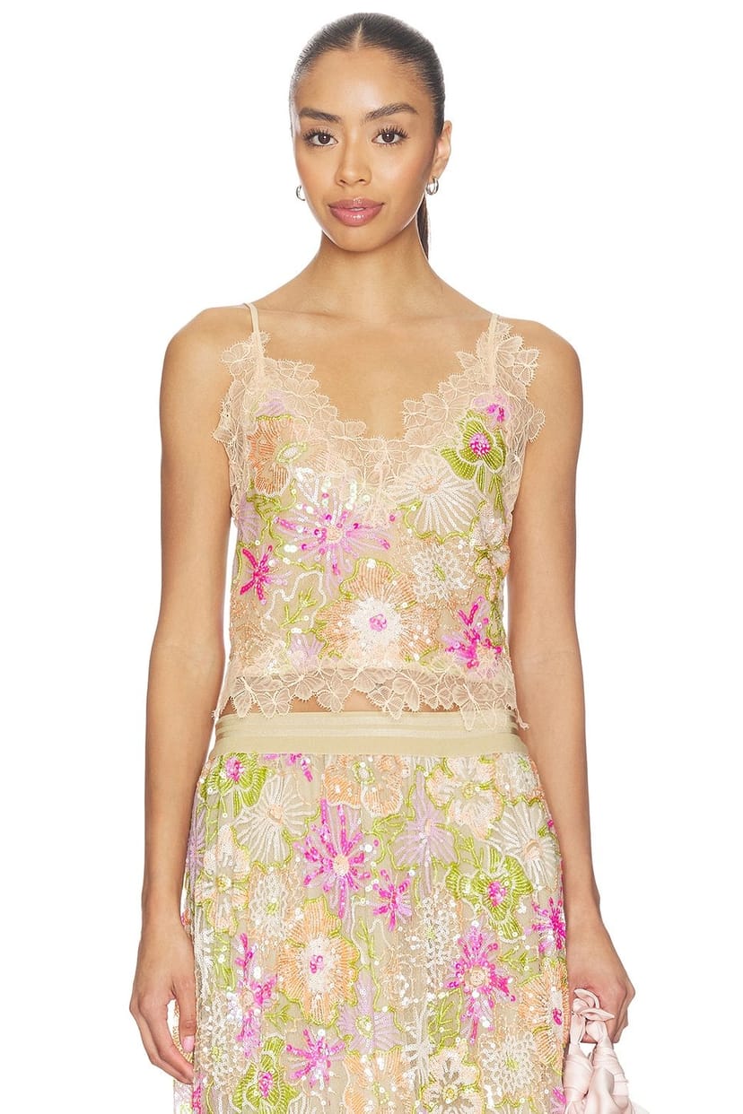 This Flori Culture Cami by Revolve features a sequin and lace design in a Flori Culture Sequins colourway. Perfect for evening events or special occasions, this piece combines elegance and glamour.