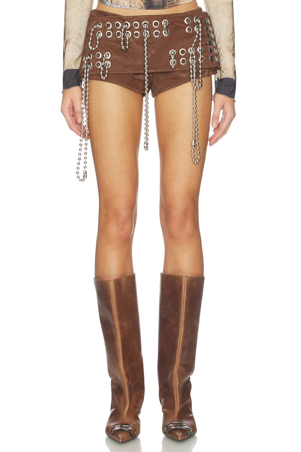 Designed with a bold brown leather finish, these shorts feature a belted waist with decorative chains, adding an edgy flair. The high-rise cut is perfect for showcasing your figure, ideal for both casual outings and night-time adventures.