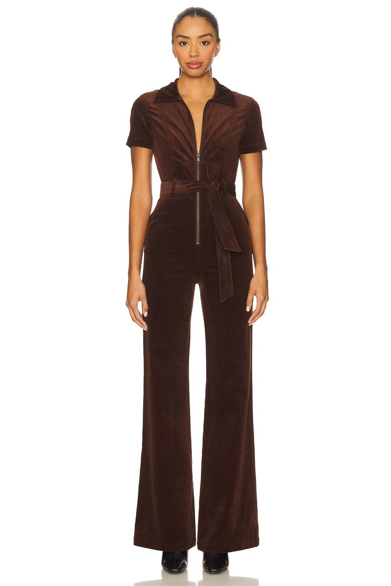 Designed with a wide leg silhouette, this Dark Chocolate velvet jumpsuit features a zipper front and belted waist. Ideal for a chic, sophisticated look.