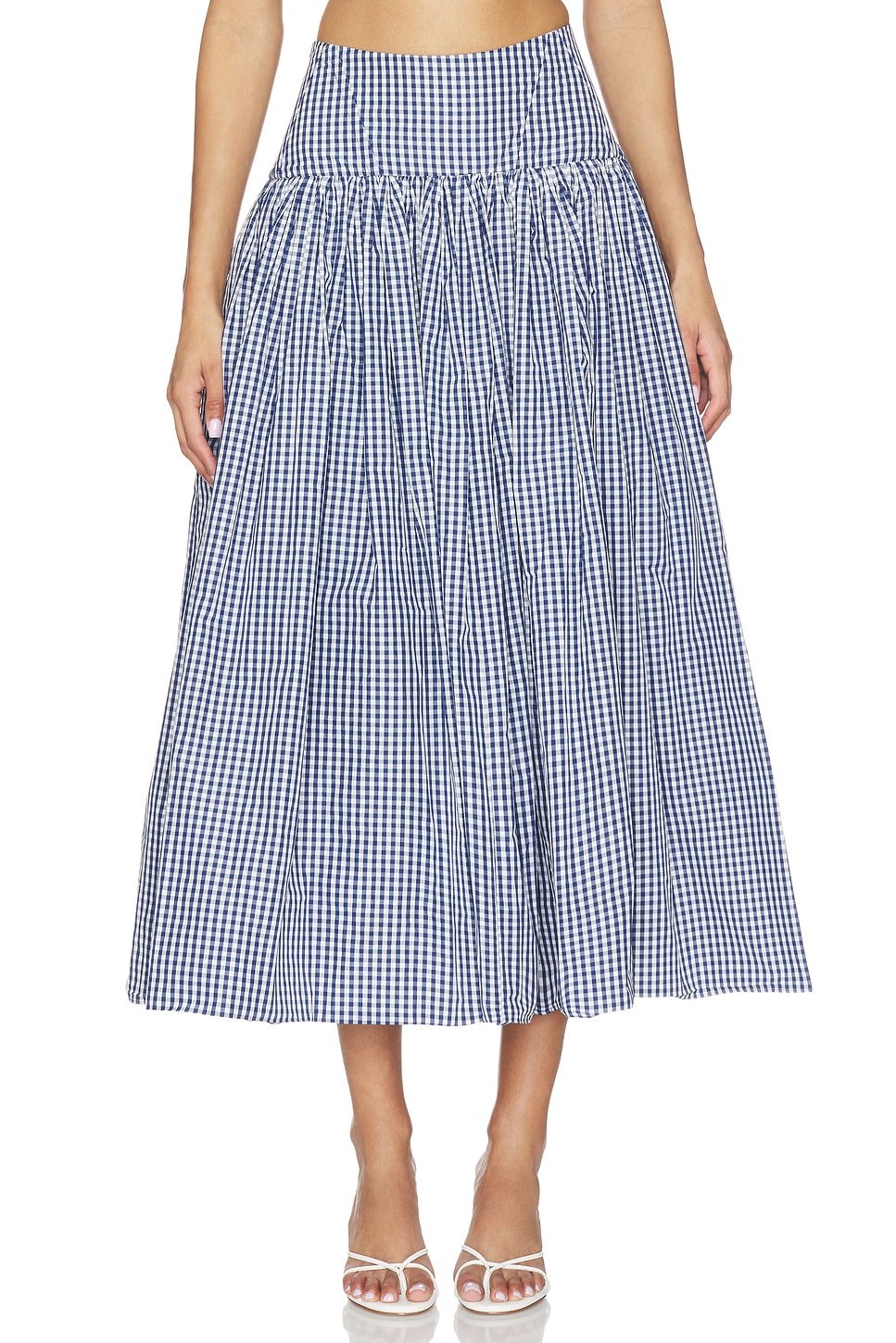 The Revolve Alexis Gingham Midi Skirt in Navy & White is available in sizes XXXL, XXL, XL, XS, L, M, S.