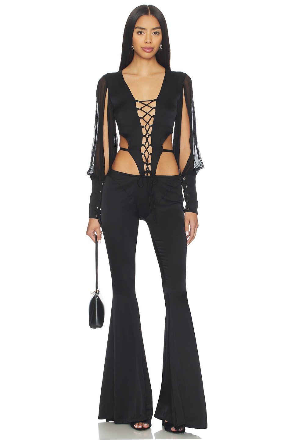 This black long sleeve deep V-neck jumpsuit by Revolve is a statement piece with its lace-up detailing and sheer mesh panels. It's perfect for a bold and daring look.