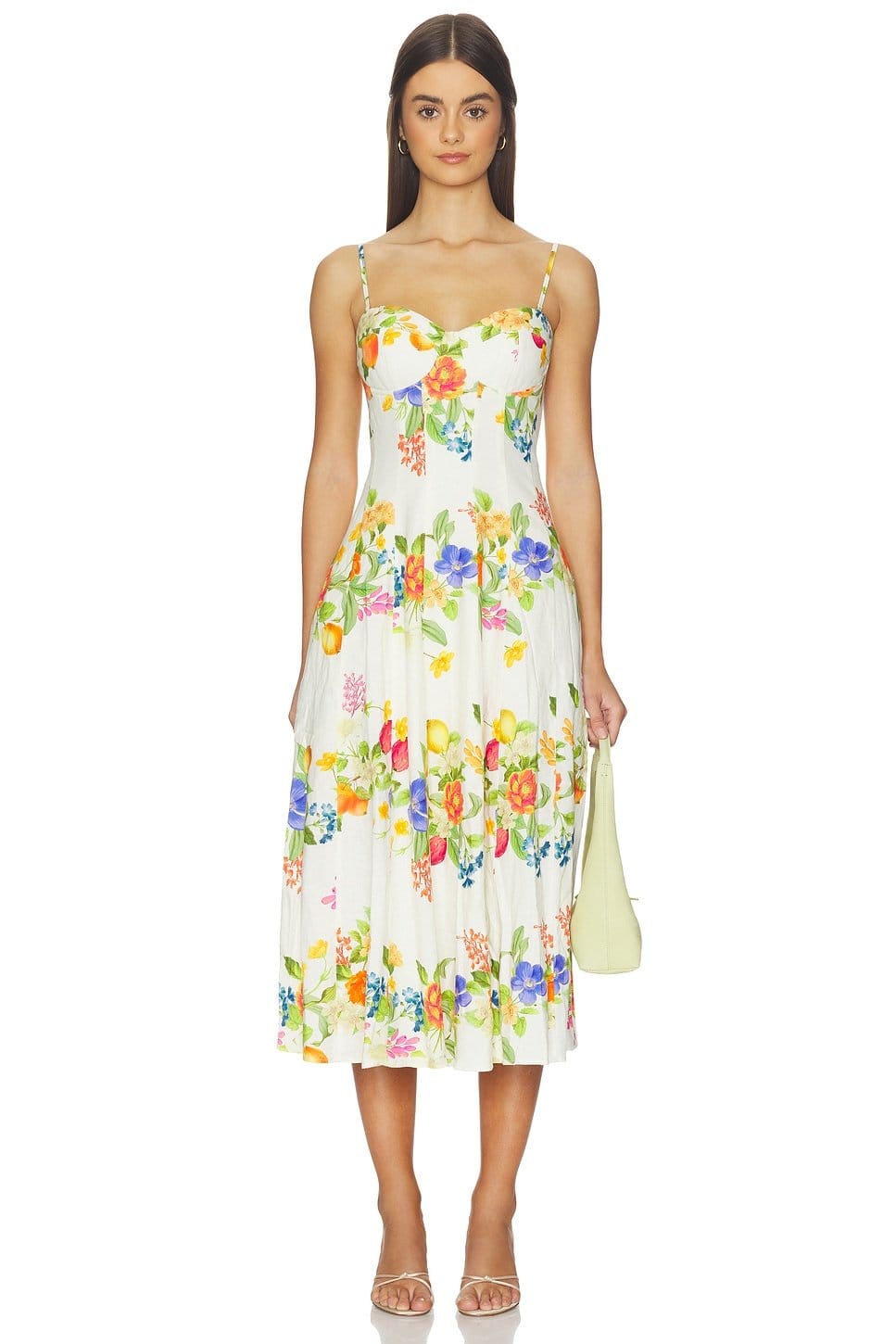The Revolve Fruit Frenzy Ivory Floral Jen Dress by Yumi Kim is available in sizes XXXL, XXL, XL, XS, L, M, S.