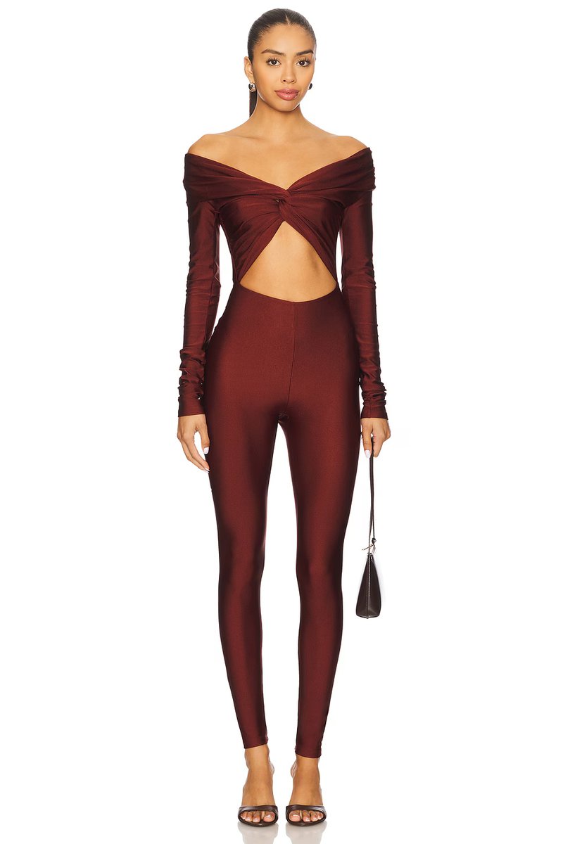 The Kendall Jumpsuit from Revolve's Andamane collection is designed in a burgundy hue, featuring an off-the-shoulder neckline and long sleeves. Its sleek and modern design makes it perfect for a variety of occasions.