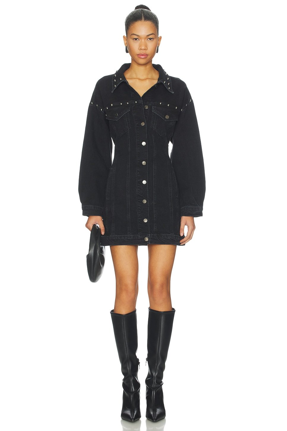 The Revolve Ladera Denim Dress with Studs in Black Stone is available in sizes XXXL, XXL, XL, XS, L, M, S.