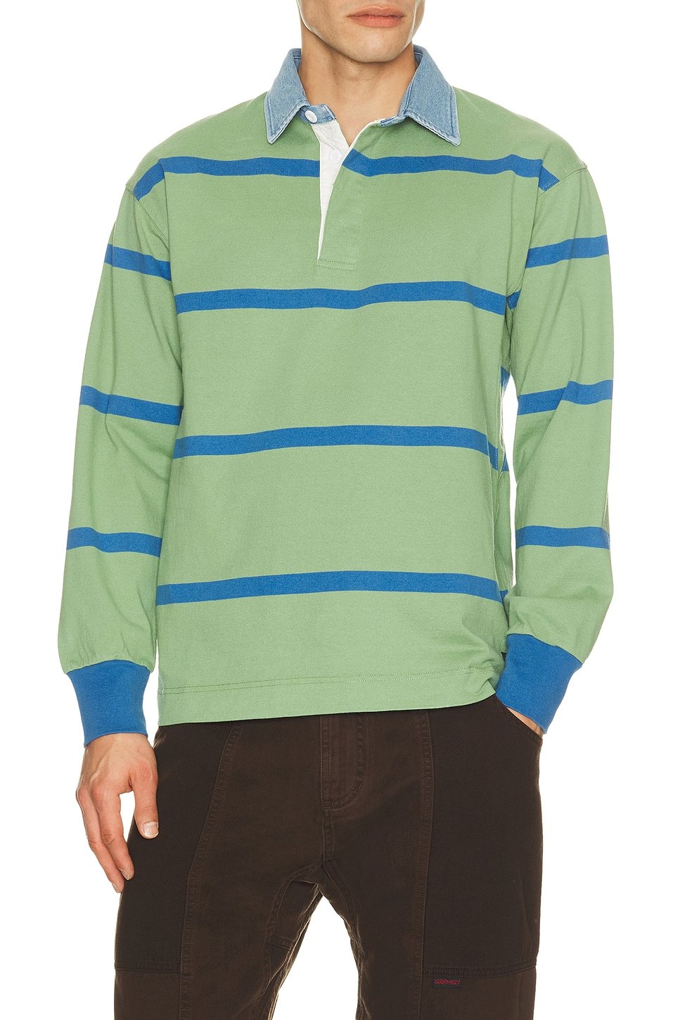 The Gramicci Langdon Rugby Shirt is a stylish blend of olive and blue stripes, perfect for casual wear. Crafted with a denim collar, it offers a unique touch to a classic rugby shirt.