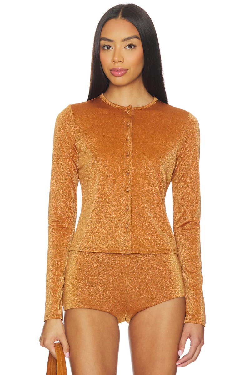 The Bronze Satin Long Sleeve Jumpsuit from Revolve is a glamorous piece that combines sleek fabric with a flattering fit. Crafted from satin, this jumpsuit features a crew neckline and long sleeves, making it perfect for a night out or special occasion.