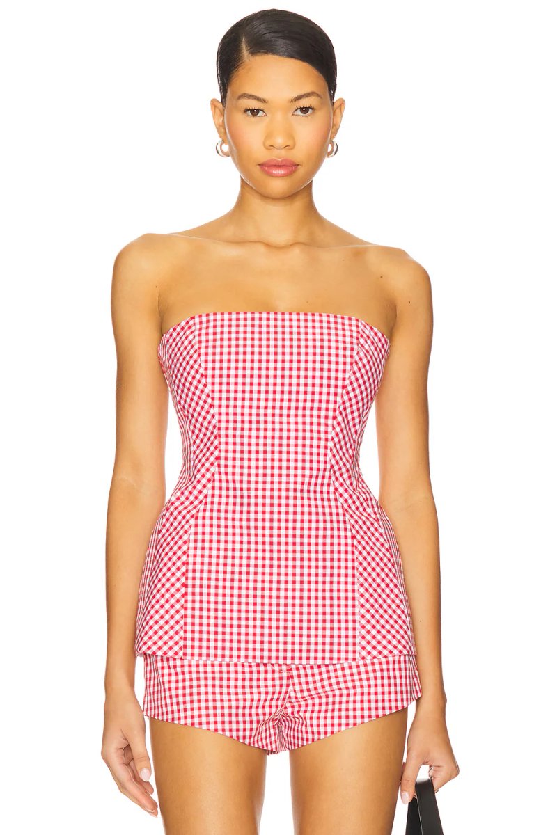 This red & white gingham corset top by Amanda Uprichard for Revolve offers a playful yet sophisticated twist. The fitted bodice and adjustable straps provide a flattering silhouette, perfect for casual outings.