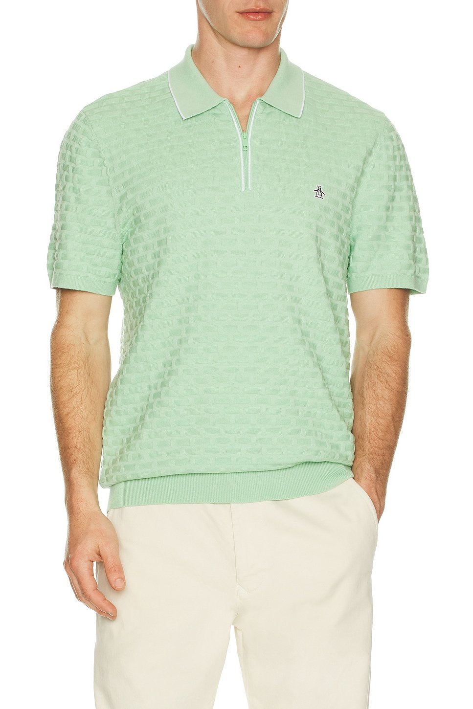The Links Stitch Polo from Original Penguin features a mesh pattern and collared neckline. Crafted in a light and breathable fabric, this polo is perfect for casual outings.