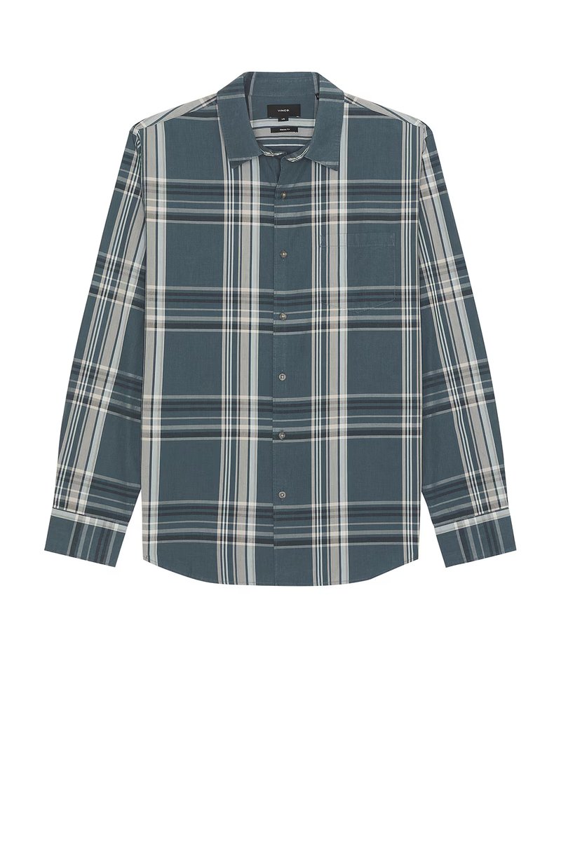 Crafted with Harbor Blue plaid fabric, this Vince shirt features a French placket and long sleeves. Perfect for a casual yet polished look.