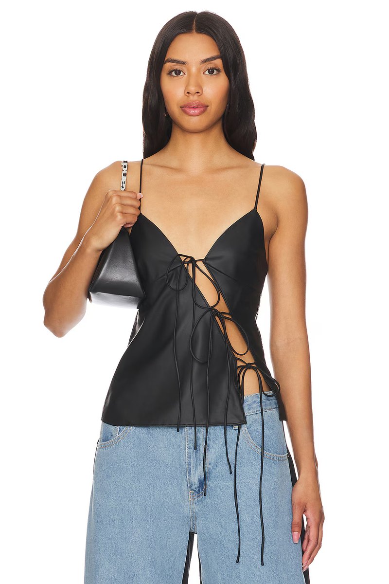 The Mariah Cami by LIONESS features a sleek Onyx color, lace detailing, and a fitted silhouette. Perfect for layering or wearing solo, this top adds a touch of sophistication to any outfit.