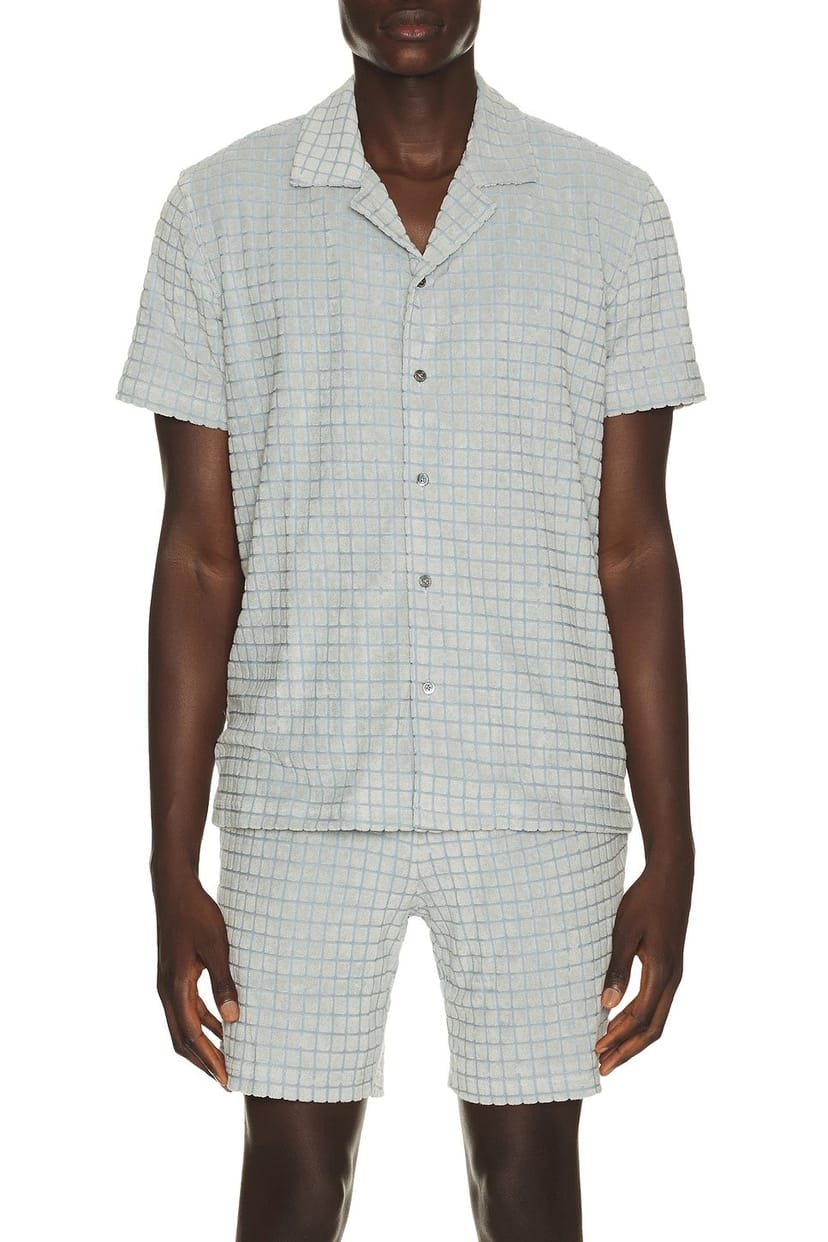 Stylish Maverick Camp Collared Shirt by Revolve in Silverline Blue Grid featuring a grid pattern and a camp collar. Perfect for a casual yet polished look.