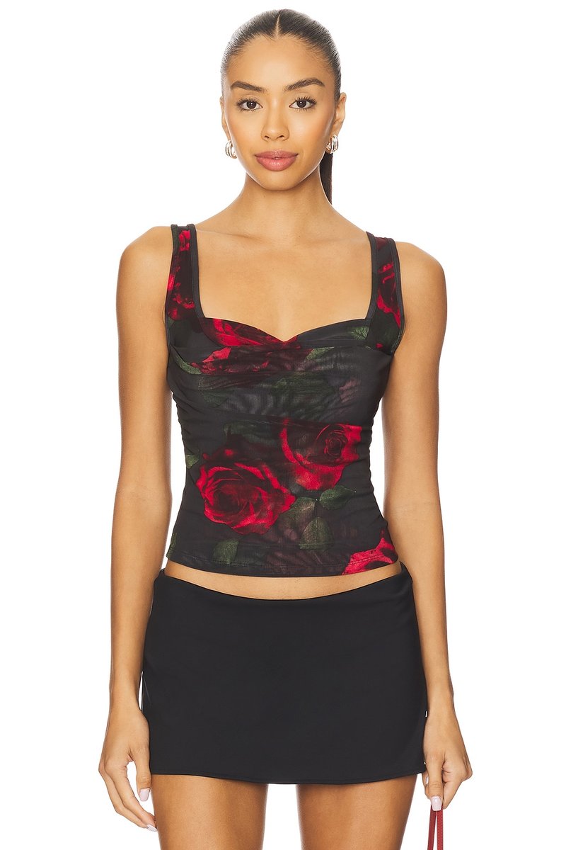 The Mesh Bustier from Good American features a stunning Moody Red Roses print, designed to highlight your silhouette. Perfect for evening outings, this piece combines elegance with a touch of boldness.