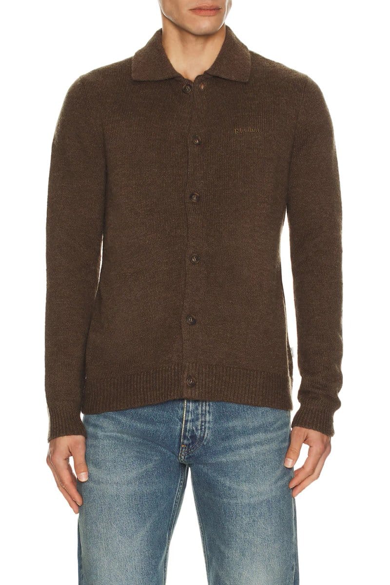 Crafted with mohair, this button-up knit cardigan in chocolate is perfect for layering. Featuring a classic collar, it's ideal for casual outings or as an everyday staple.