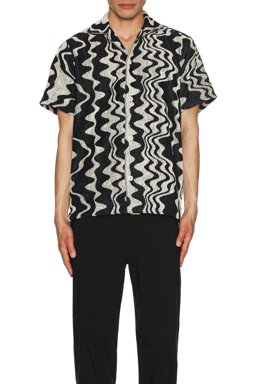 This Nero Verve Cuba Terry Shirt in black features a bold geometric pattern and a button-down front. Made from soft terry fabric, it offers a casual yet stylish look. Ideal for relaxed outings or casual gatherings.