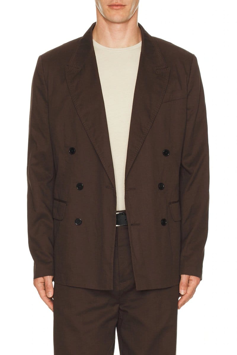 Designed with a Baked Brown color, this double-breasted blazer features a notch lapel collar and button closure. Perfect for a polished look.