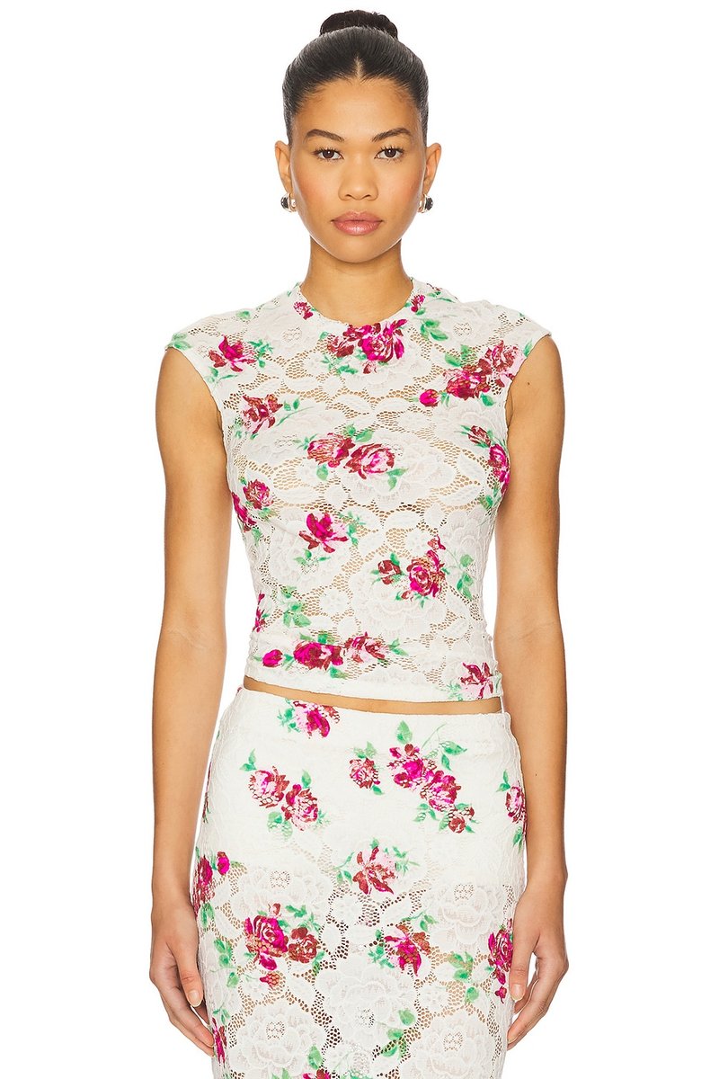 The Nina Crochet Lace Top from Revolve's AFRM line features a stunning floral print in Romance Rose. Crafted with delicate lace, it adds an elegant touch to any outfit.