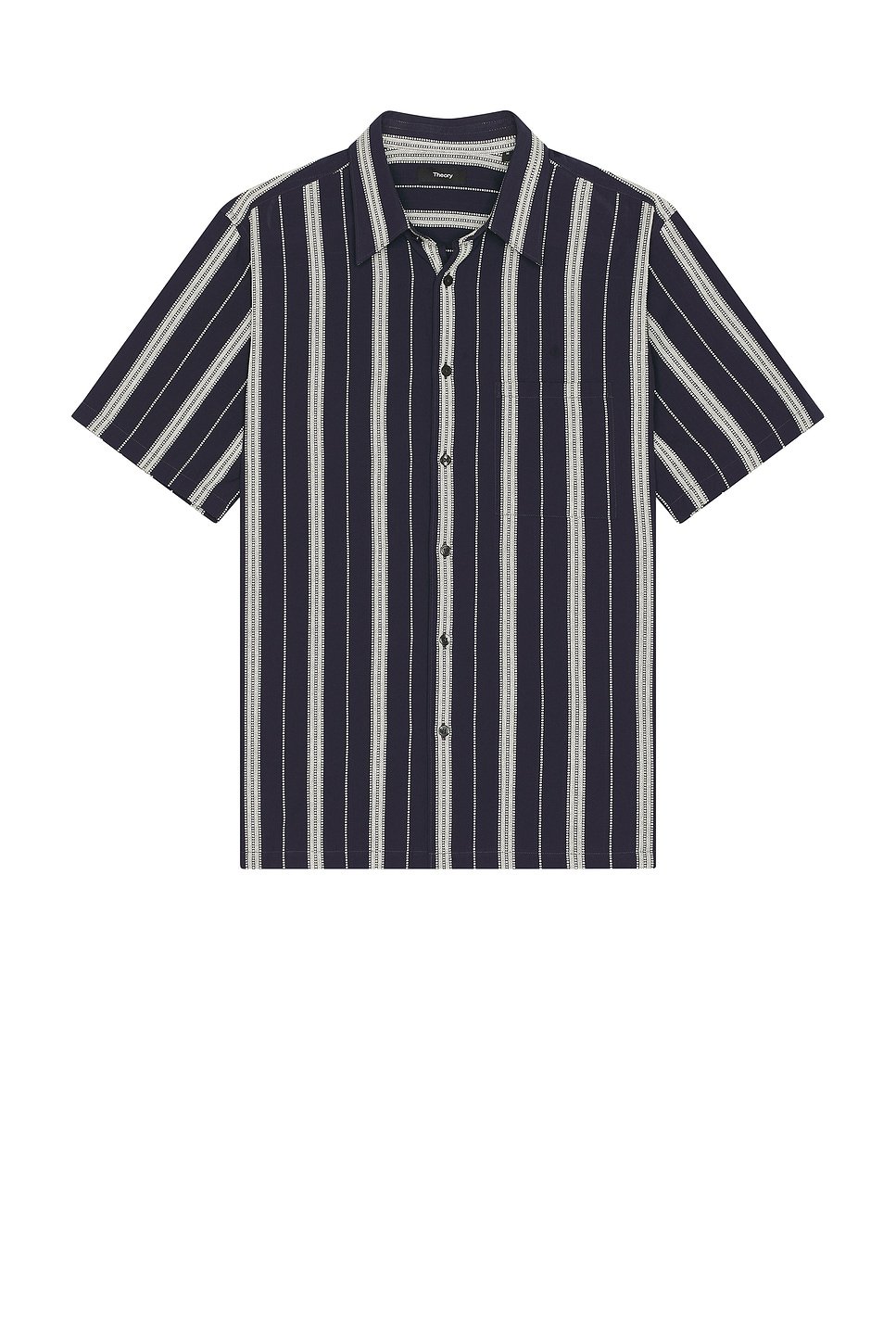 The Noll Short Sleeve Shirt from Theory features a navy and white striped pattern with a button-front closure and a spread collar. The lightweight fabric ensures comfort for casual outings.