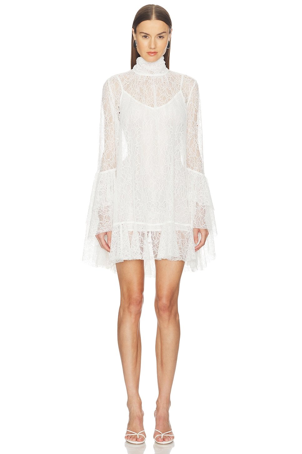 Ivory Lace Mini Dress — the perfect choice for a chic and elegant look. Designed in Ivory, this lace mini dress features a high neckline and long sleeves for a sophisticated touch. Crafted from lightweight sheer lace with delicate ruffles, it adds a touch of romance to any outfit. Ideal for evening events, date nights, and special occasions.