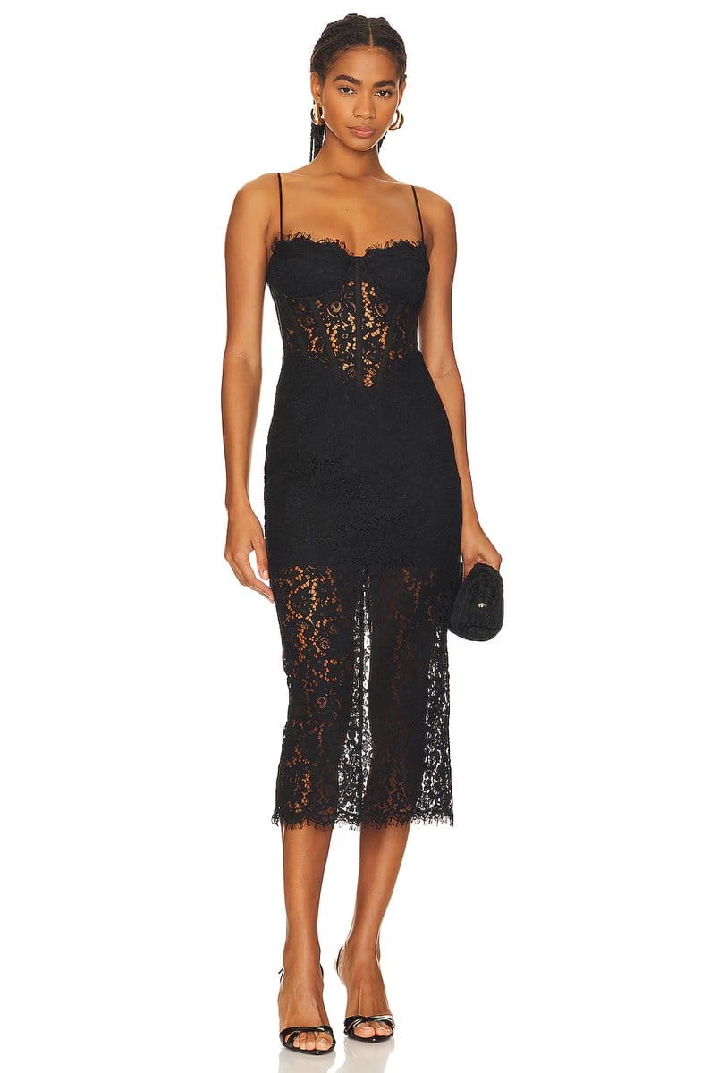 The Revolve Bardot Corset Midi Dress in Black is ideal for party, date-night.