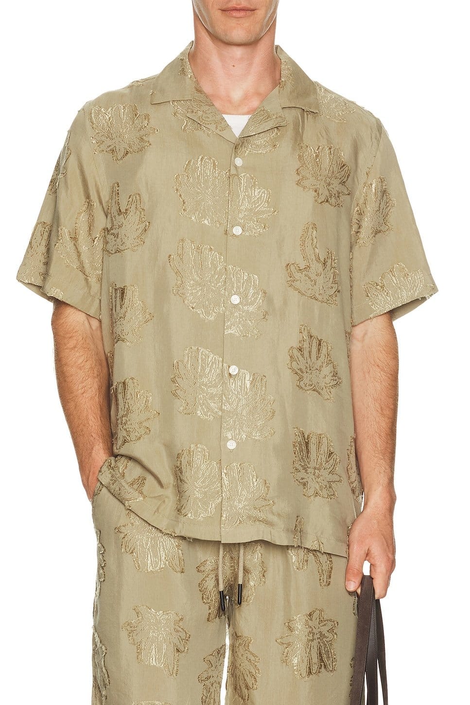 This Palmoza Rocco Shirt by Revolve features a light brown base with a gold floral print. Crafted from a lightweight fabric, it offers a relaxed fit with a button-down front and short sleeves. Ideal for casual outings or as a statement piece in your wardrobe.